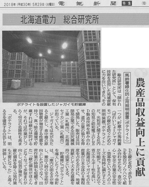 電気新聞 (平成30年5月29日)にて「ジャガイモ緑化防止 LED」が紹介されました