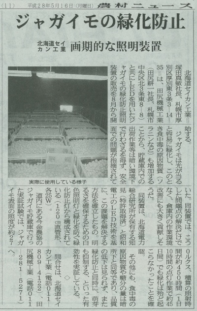 農村ニュース(平成28年5月16日)にて「ジャガイモ緑化防止 LED」が紹介されました